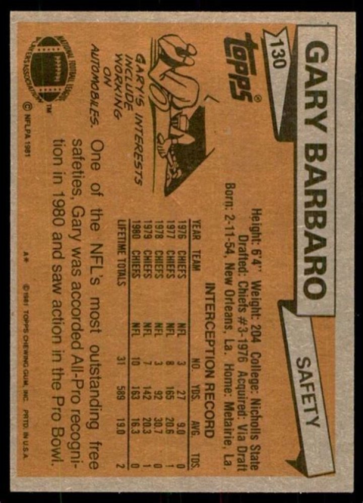 The 6-foot-4, 200-pound Barbaro spent seven seasons with the Chiefs, earning Pro Bowl honors following the 1980, 1981, and 1982 seasons.